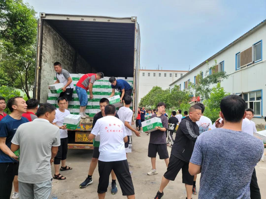 一辆满载纯净水和食品等抗洪救灾物资的卡车,